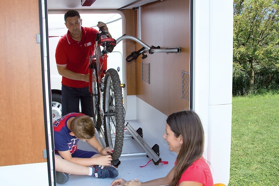 Carry-Bike Garage for all motorhomes with garage storage facility. The lower section is fixed to the floor and the upper Bike-Block is fixed to the wall or garage roof. Can be folded up when not in use, providing more space should it be required.